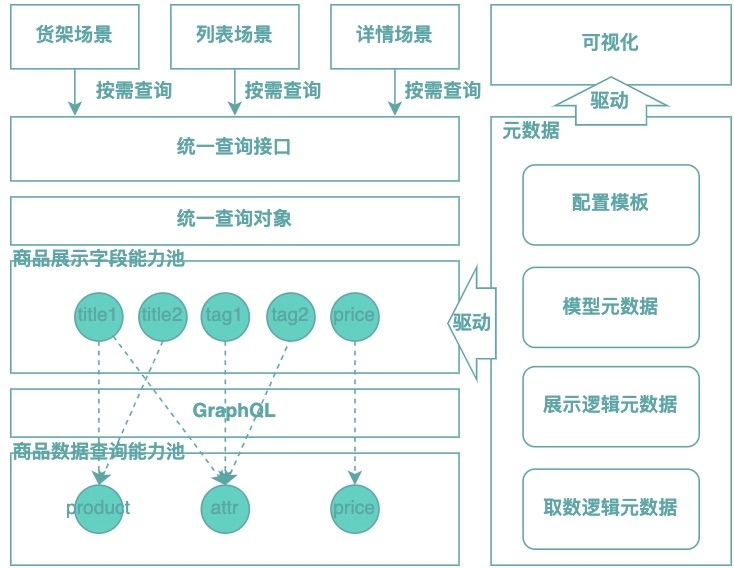 从上图可看出,与传统GraphQL BFF方案最大的差别在于我们将GraphQL下放至数据聚合部分,由于数据来源于商品领域,领域是相对稳定的,因此数据图规模可控且相对稳定。除此之外,整体架构的核心设计还包括以下三个方面:1)取数展示分离;2)查询模型归一;3)元数据驱动架构。