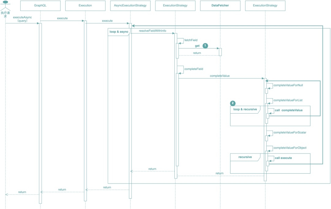 以上时序图做了些简化,去除了一些与重点无关的信息,AsyncExecutionStrategy的execute方法是对象执行策略的异步化模式实现,是查询执行的起点,也是根节点查询的入口,AsyncExecutionStrategy对对象的多个字段的查询逻辑,采取的是循环+异步化的实现方式,我们从AsyncExecutionStrategy的execute方法触发,理解GraphQL查询过程如下: