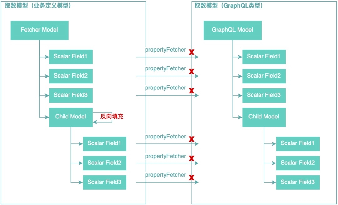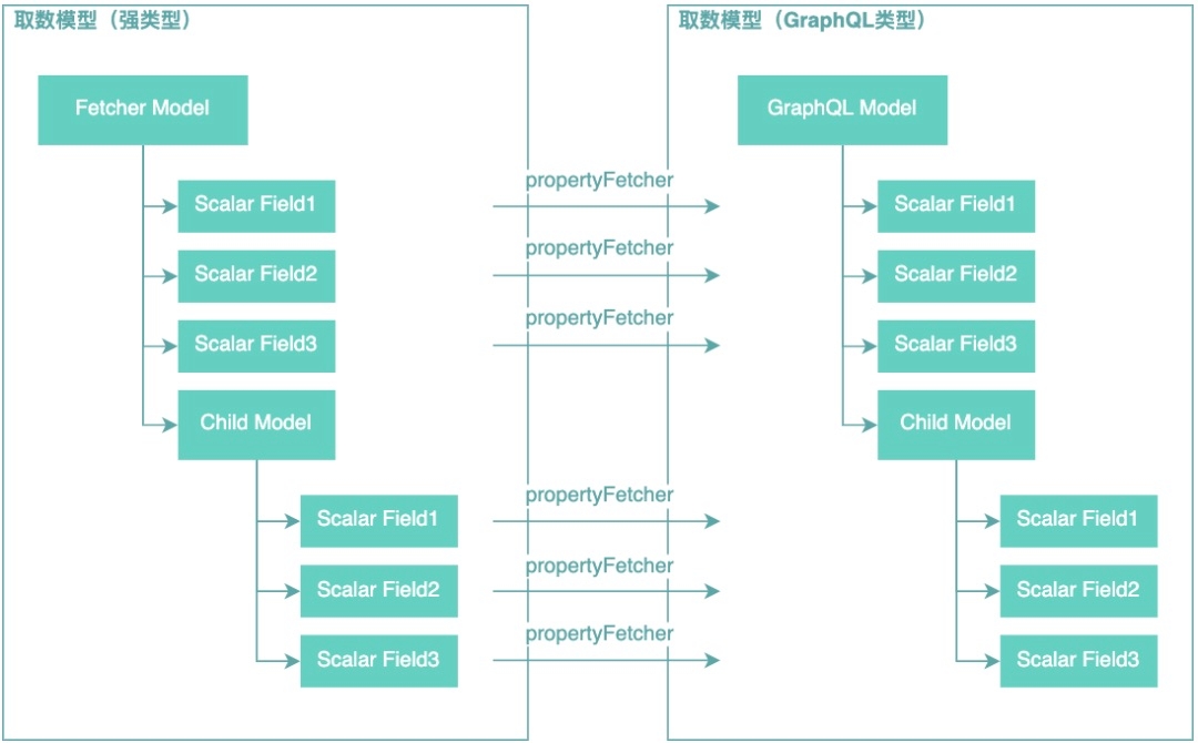 通过GraphQL查询引擎拿到的GraphQL模型,和业务实现的DataFetcher返回的取数模型是同构,但是所有字段的类型都会被转换成GraphQL内部类型。PropertyDataFetcher之所以会成为CPU热点,问题就在于这个模型转换过程,业务定义的模型到GraphQL类型模型转换过程示意图如下图所示: