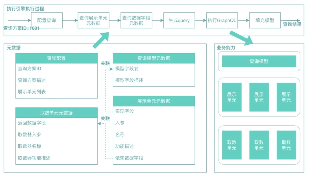 元数据:描述业务功能(如:展示单元、取数单元)以及业务功能之间的关联关系,比如展示单元依赖的数据,展示单元映射的展示字段等。