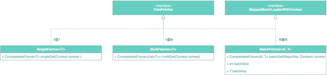 首先要简化数据的接入,原生的DataFetcher和DataLoader都是处在一个比较高的抽象层次,缺少业务语义,而在查询场景,我们能够归纳出,所有的查询都属于以下三种模式: