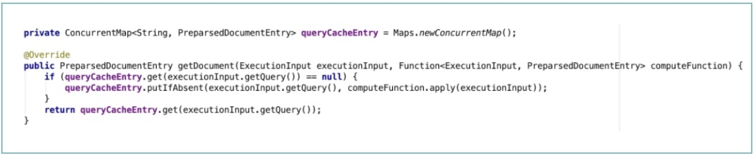 Schema表达的是数据视图和取数模型同构,相对稳定,个数也不多,在我们的业务场景一个服务也就一个。因此,我们的做法是在启动的时候就将基于Schema构造的GraphQL执行引擎构造好,作为单例缓存下来。对于Query来说,每个场景的Query有些差异,因此Query的解析结果不能作为单例,我们的做法是实现PreparsedDocumentProvider接口,基于Query作为Key将Query编译结果缓存下来。如下图所示:
