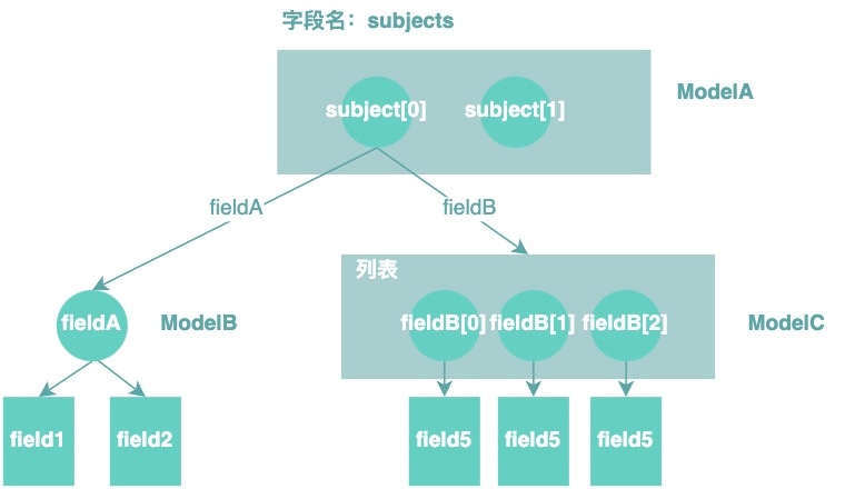 假设我们查询到的模型结构如下:根节点是Query下的字段,字段名叫subjects,subject引用的是个列表,subject下有两个元素,都是ModelA的对象实例,ModelA有两个字段,fieldA和fieldB,subjects[0]的fieldA关联是ModelB的一个实例,subjects[0]的fieldB关联多个ModelC实例。