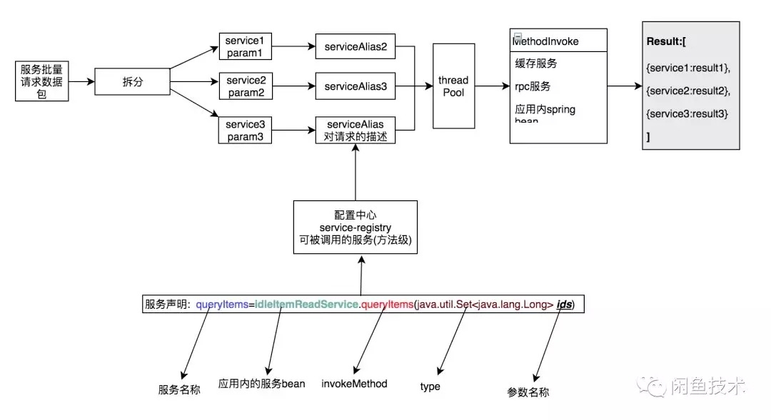 闲鱼服务端开发了第一个数据聚合服务。 通过将底层服务暴露出来,从请求总入口进行并发调用具体的服务接口,页面多个服务查询可以一次性将所有的数据返回给前端。 调用过程如下: