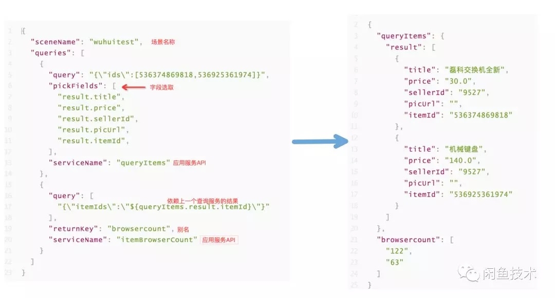 全并发调用,调用的多个服务API均采用并发方式调用,耗时低 此外我们对其语法结构和功能上进行了扩展:支持字段选取,依赖调用,循环依赖检查,别名等功能