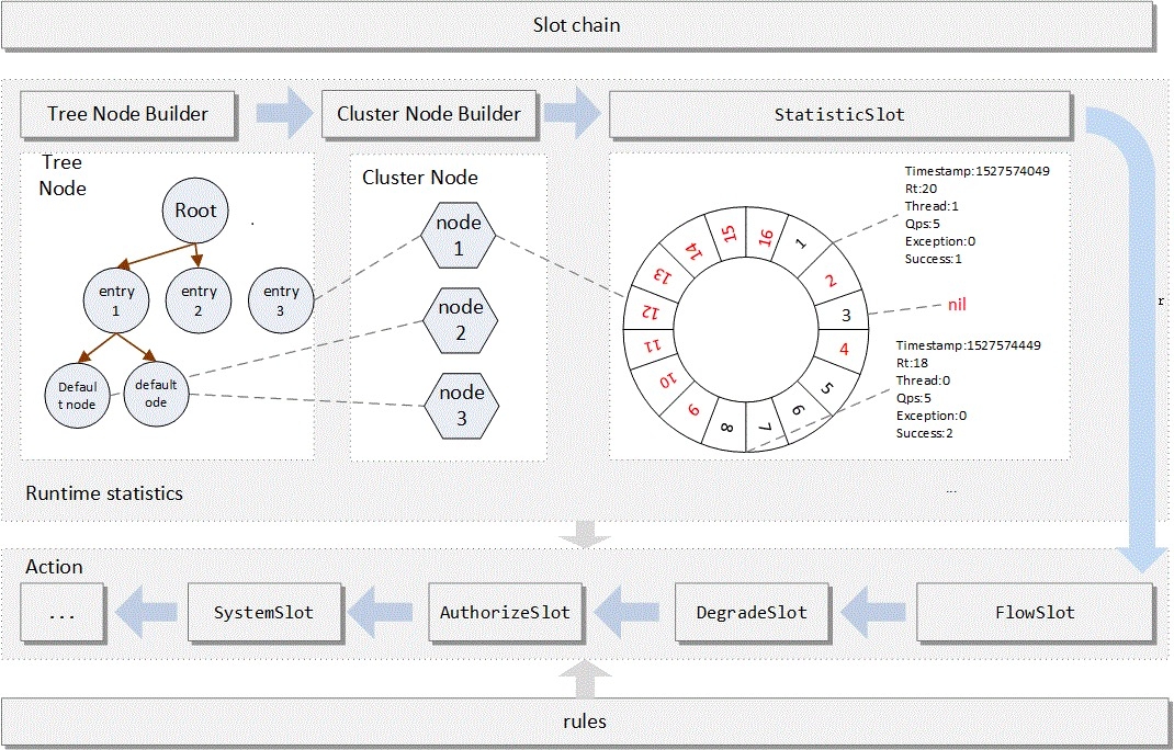 NodeSelectorSlot负责收集资源的路径,并将这些资源的调用路径,以树状结构存储起来,用于根据调用路径来限流降级;ClusterBuilderSlot则用于存储资源的统计信息以及调用者信息,例如该资源的 RT, QPS, thread count 等等,这些信息将用作为多维度限流,降级的依据;StatisticSlot则用于记录、统计不同纬度的 runtime 指标监控信息;FlowSlot则用于根据预设的限流规则以及前面 slot 统计的状态,来进行流量控制;AuthoritySlot则根据配置的黑白名单和调用来源信息,来做黑白名单控制;DegradeSlot则通过统计信息以及预设的规则,来做熔断降级;SystemSlot则通过系统的状态,例如 load1 等,来控制总的入口流量;