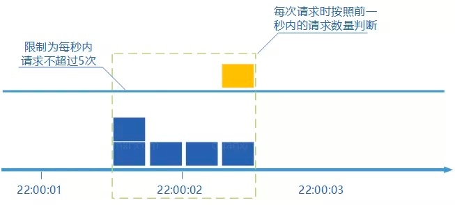 如果当前窗口内区间的请求计数总和超过了限制数量,则本窗口内所有的请求都被丢弃。