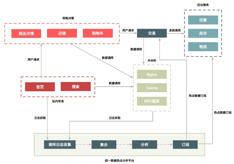 建立一个热点上报和可以按照需求订阅的热点服务的下发规范,主要目的是通过交易链路上各个系统(包括详情、购物车、交易、优惠、库存、物流等)访问的时间差,把上游已经发现的热点透传给下游系统,提前做好保护。