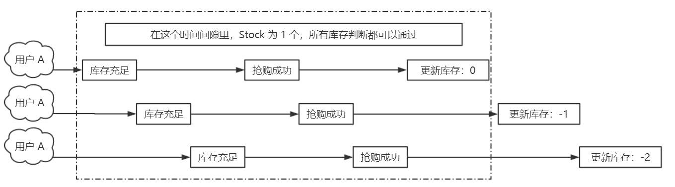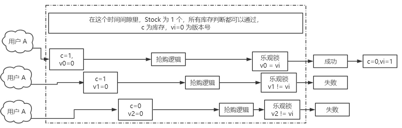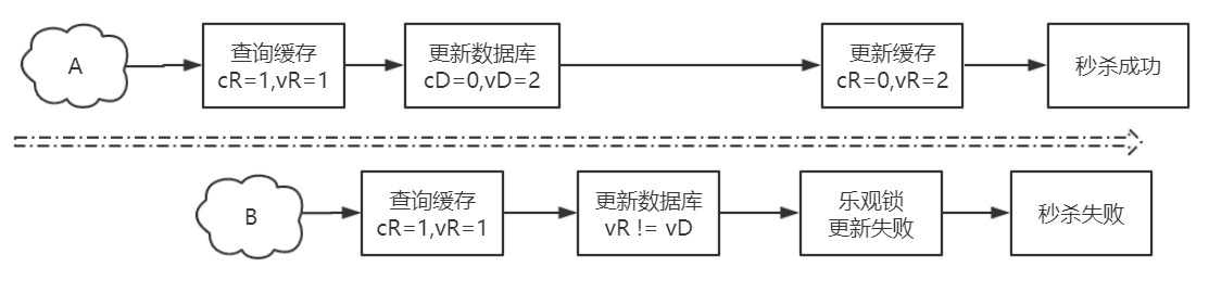 在 A 未更新缓存阶段,虽然 B 从缓存中获取到的库存信息脏数据,但是,乐观锁使得 B 在更新数据库时失败,这时 A 又更新了缓存,则保证了数据的最终一致性,并且由于缓存一直都可以命中,对并发量的提升也是很显著的。
