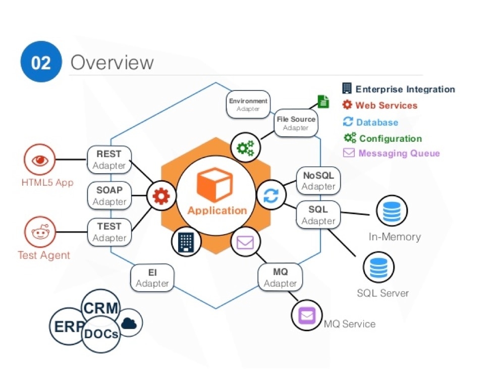 而外部的,也是我们平时最熟悉的诸如REST,SOAP,NoSQL,SQL,Message Queue等,都通过一个端口接入,然后在内外之间有一个适配器组成的层,它负责将不同端口来的数据进行转换,翻译成领域内部可以识别的概念(领域对象,领域事件等)。