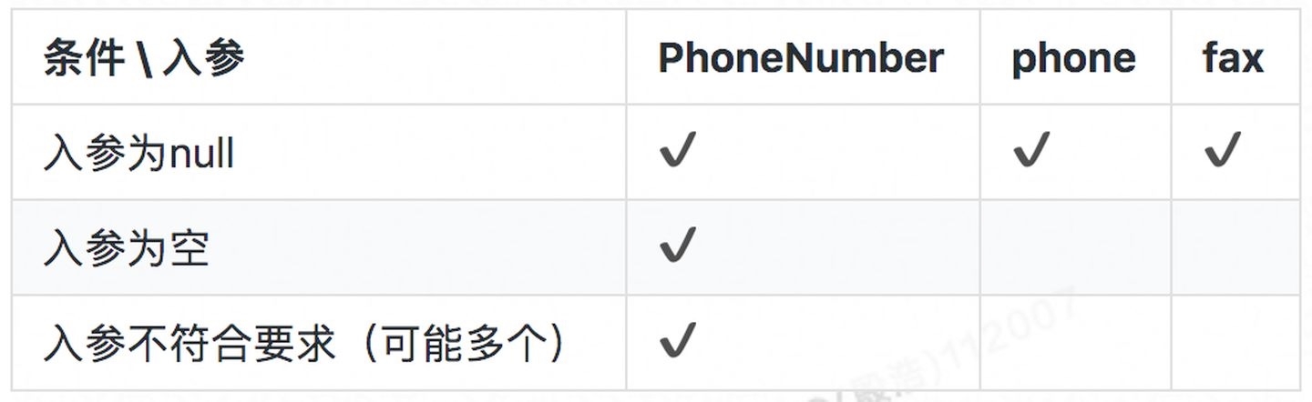 在日常编码中经常会出现,一般来说这种代码需要出现在方法的最前端,确保能够 fail-fast 。但是假设你有多个类似的接口和类似的入参,在每个方法里这段逻辑会被重复。而更严重的是如果未来我们要拓展电话号去包含手机时,很可能需要加入以下代码: