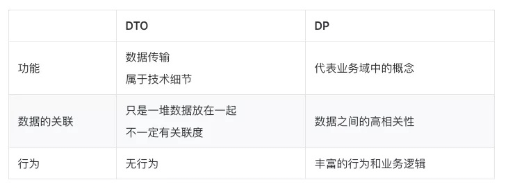 在日常开发中经常会碰到的另一个数据结构是 DTO ,比如方法的入参和出参。DP 和 DTO 的区别如下: