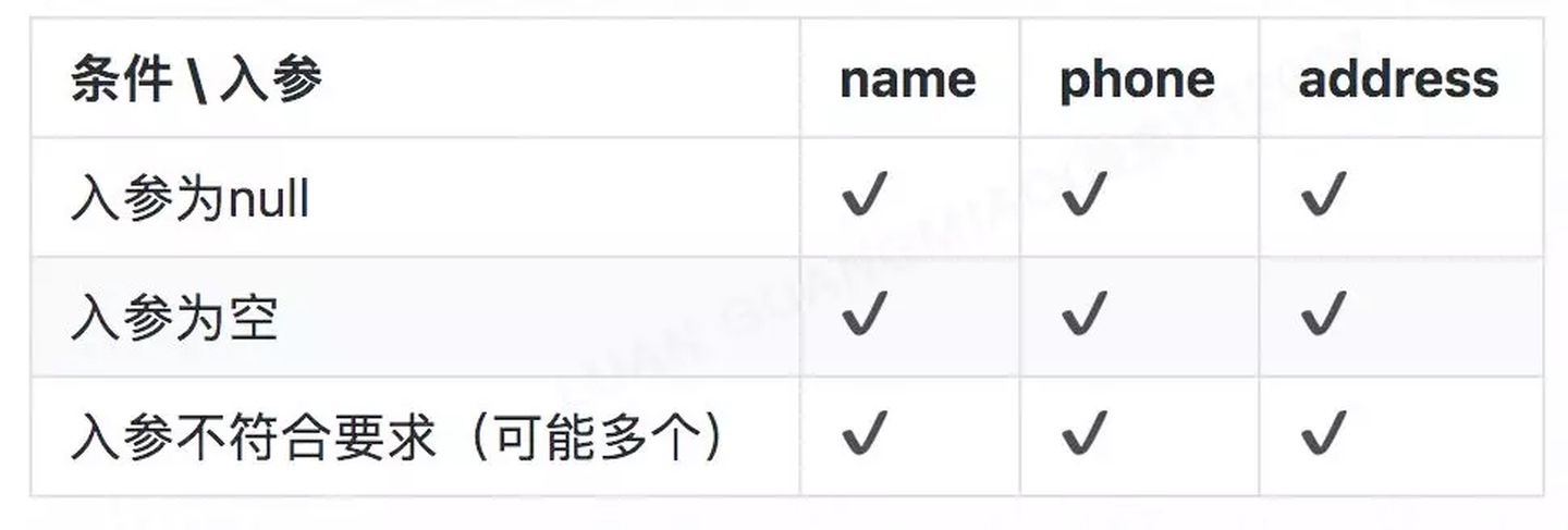 为了保证代码质量,每个方法里的每个入参的每个可能出现的条件都要有 TC 覆盖(假设我们先不去测试内部业务逻辑),所以在我们这个方法里需要以下的 TC :