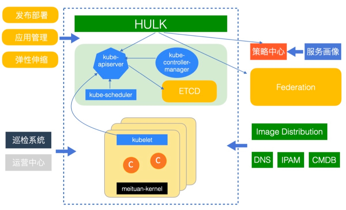 容器化的核心思路是让Kubernetes做好资源层面的管理,而通过上层的控制层解决对美团应用管理系统和运维系统的依赖问题,保持Kubernetes的原生兼容性,减少后续的维护成本,并完成了快速收敛资源管理的需求。同时,也减少了用户基于新平台的资源申请的学习成本,这点非常重要,也是后续我们能快速大规模迁移基础设施资源的“基础”。