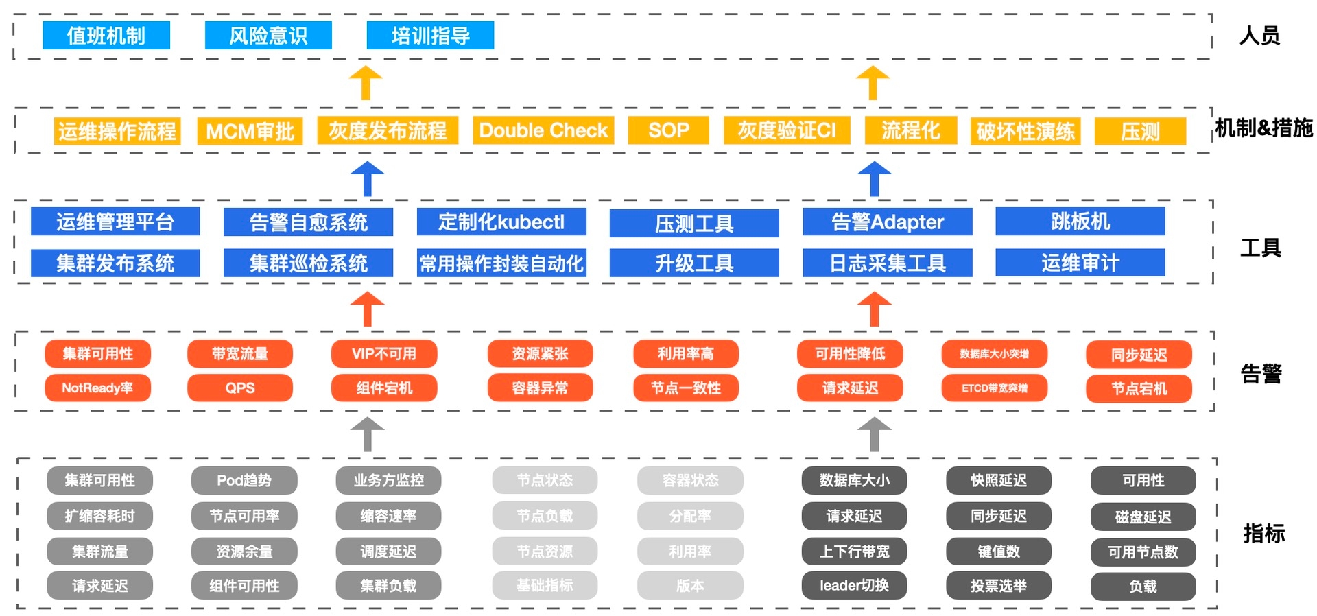 在整个风险管控链路中,我们分为指标、告警、工具、机制&措施和人员5个层面: