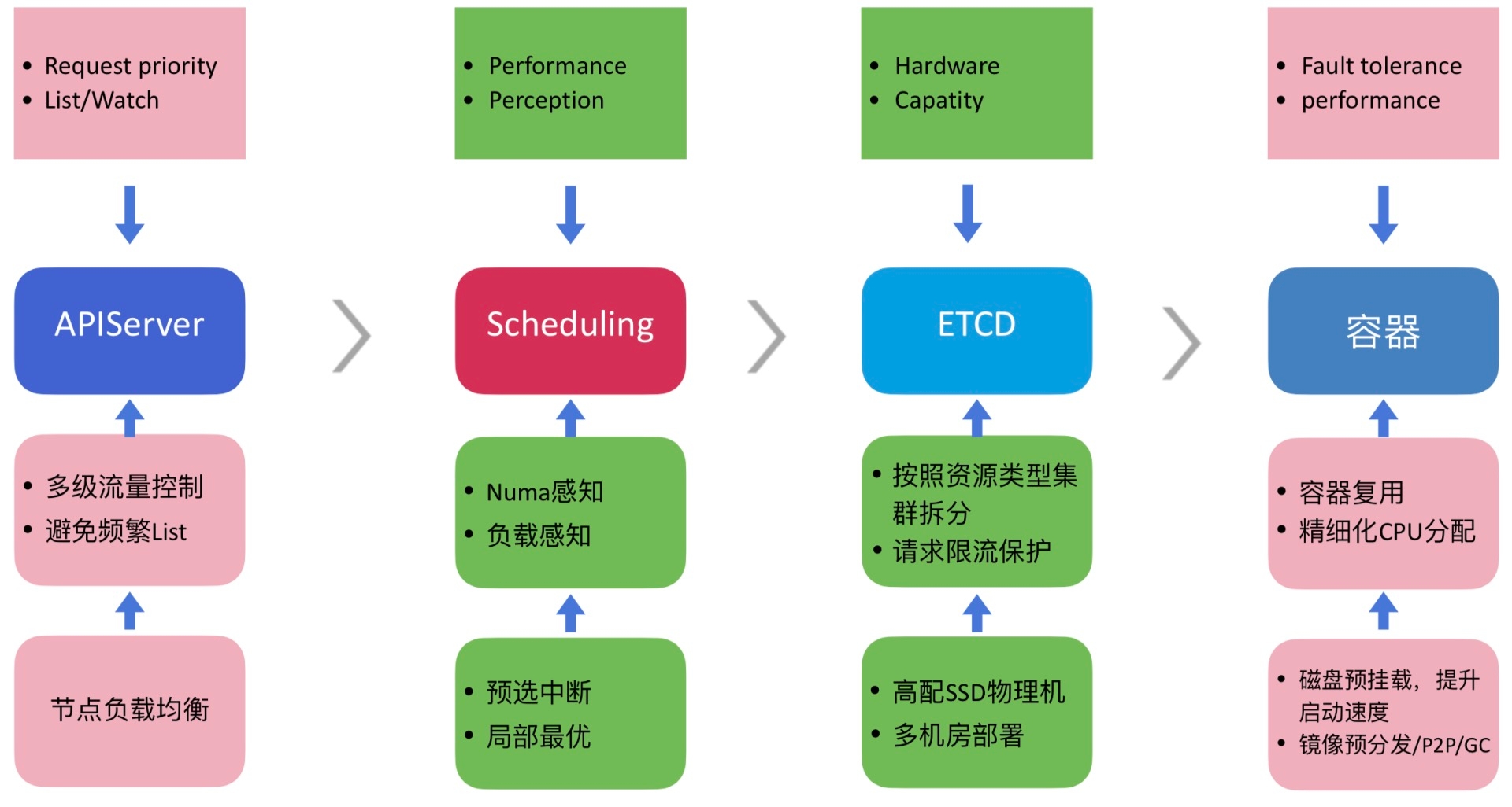 针对核心组件的分析和优化,这里从kube-apiserver、kube-scheduler、etcd以及容器等四个方面来概括下。