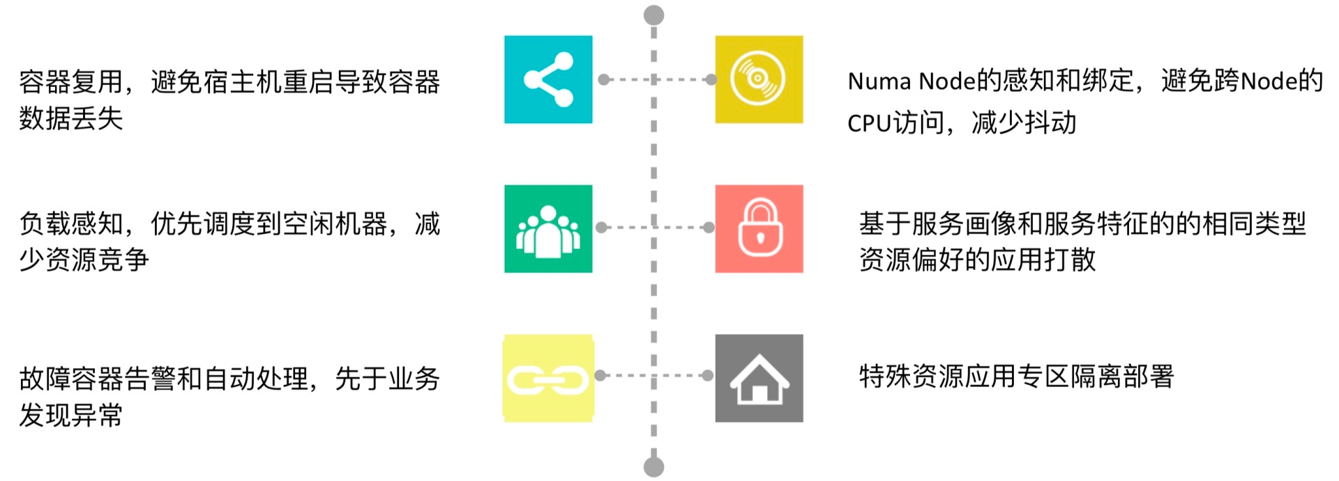 在容器层面,容器复用提升了容器的故障容忍能力,并通过精细化的CPU分配提升应用稳定性;通过容器的磁盘预挂载提升Node的故障恢复速度。