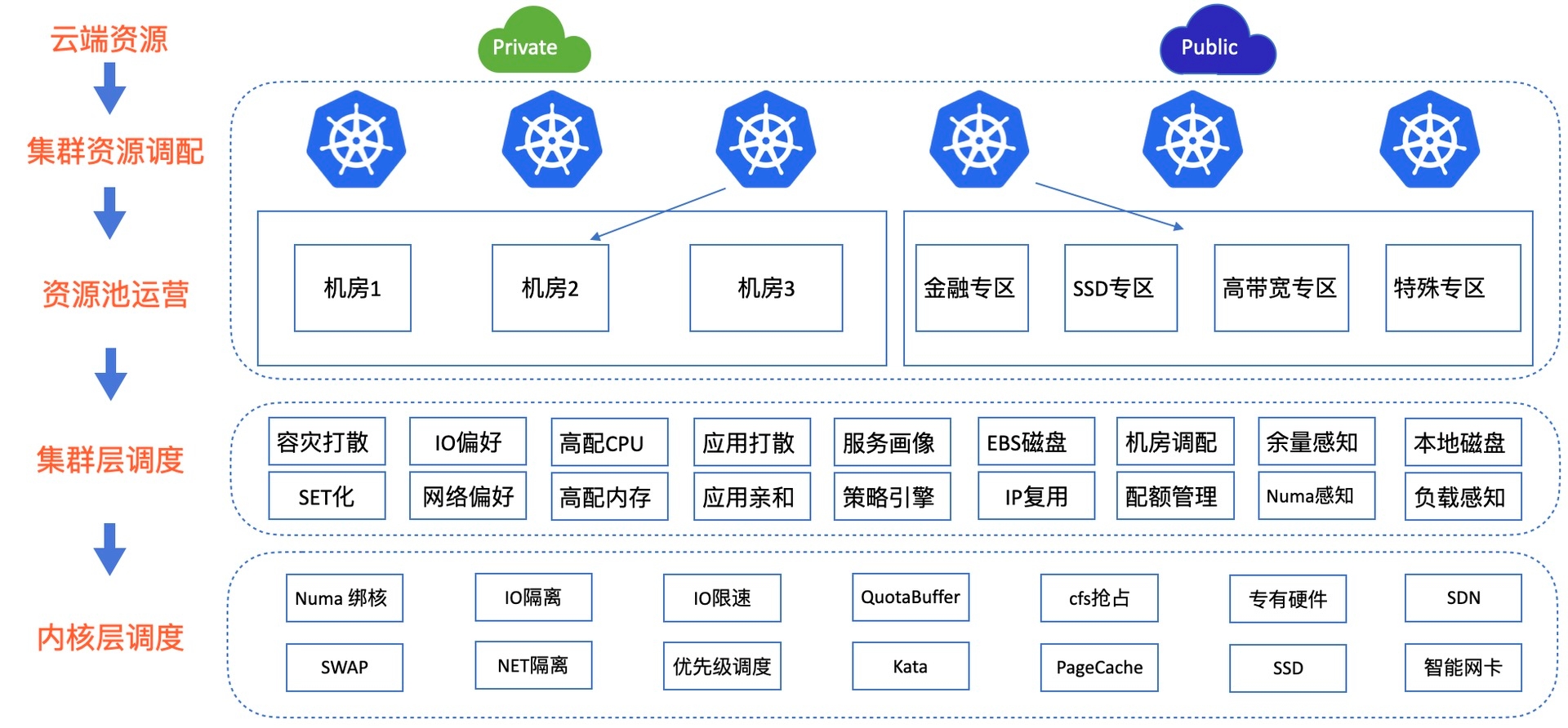 我们依托私有云和公有云资源,部署多个Kubenretes集群,这些集群有些是承载通用业务,有些是为特定应用专有的集群,在集群维度对云端资源进行调配,包括机房的划分、机型的区分等。在集群之下,我们又根据不同的业务需要,建设不同业务类型的专区,以便做到资源池的隔离来应对业务的需要。更细的维度,我们针对应用层面的资源需求、容灾需求以及稳定性等做集群层的资源调度,最后基于底层不同硬件以及软件,实现CPU、MEM和磁盘等更细粒度的资源隔离和调度。