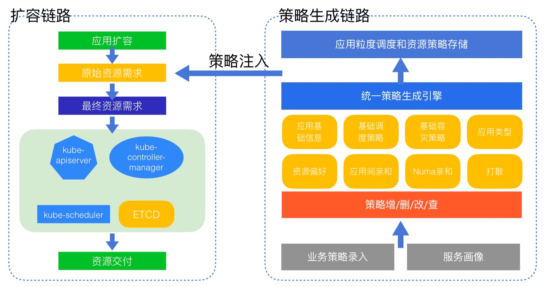 为了解决这些问题,我们为扩容链路增加了策略引擎,业务可以对自己的应用APPKEY自定义录入策略需求,同时基于大数据分析的服务画像,也会根据业务特点和公司的应用管理策略为业务策略推荐,最终这些策略会保存到策略中心。在扩容过程中,我们会自动为应用的实例打上对应的需求标签,并最终在Kubenretes中生效,完成预期的资源交付。