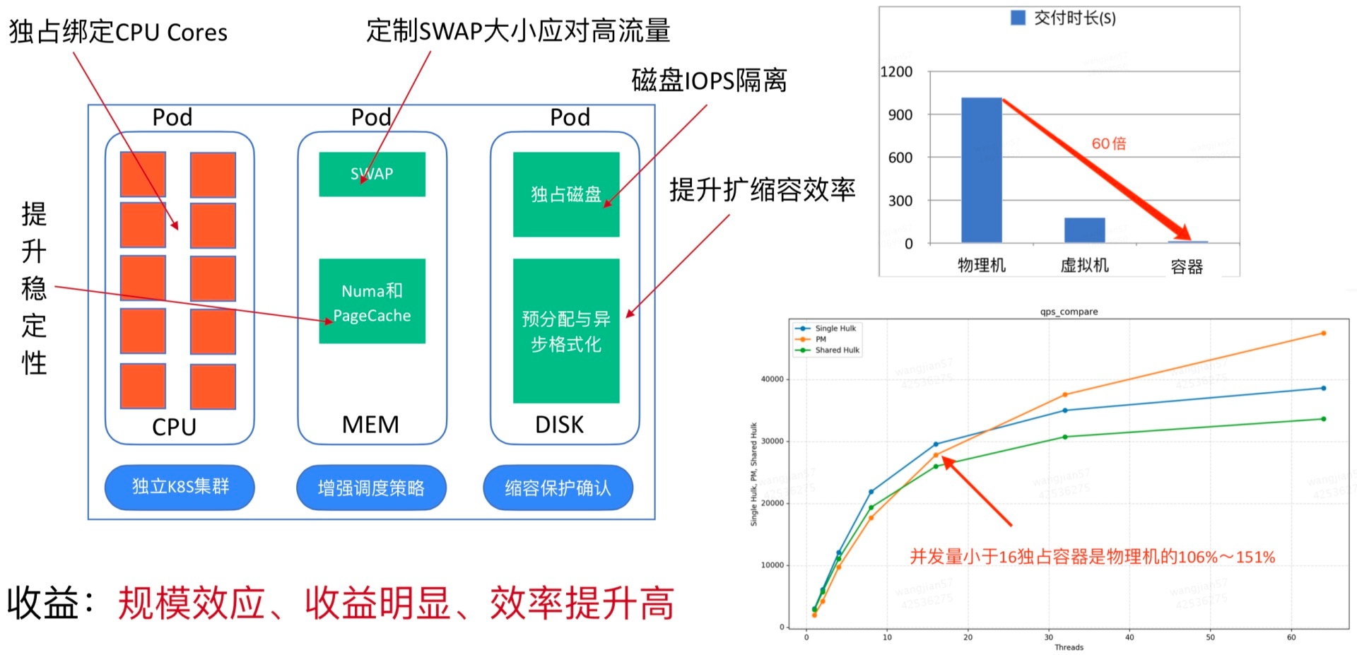 虚拟化本身资源占用多:虚拟化本身大概占用10%的宿主机资源消耗,在集群规模足够大的时候,这是一块非常大的资源浪费。