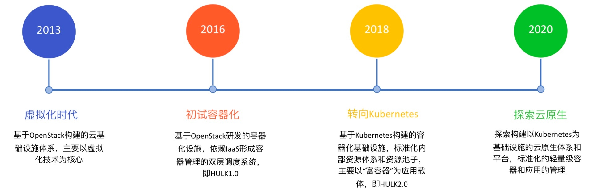 从2013年开始,美团就以虚拟化技术为核心构建了云基础设施平台;2016年,开始探索容器技术并在内部进行落地,在原有OpenStack的资源管理能力之上构建了Hulk1.0容器平台;2018年,美团开始打造以Kubernetes技术为基础的Hulk2.0平台;2019年年底,我们基本完成了美团云基础设施的容器化改造;2020年,我们坚信Kubernetes才是未来的云基础设施标准,又开始探索云原生架构落地和演进。