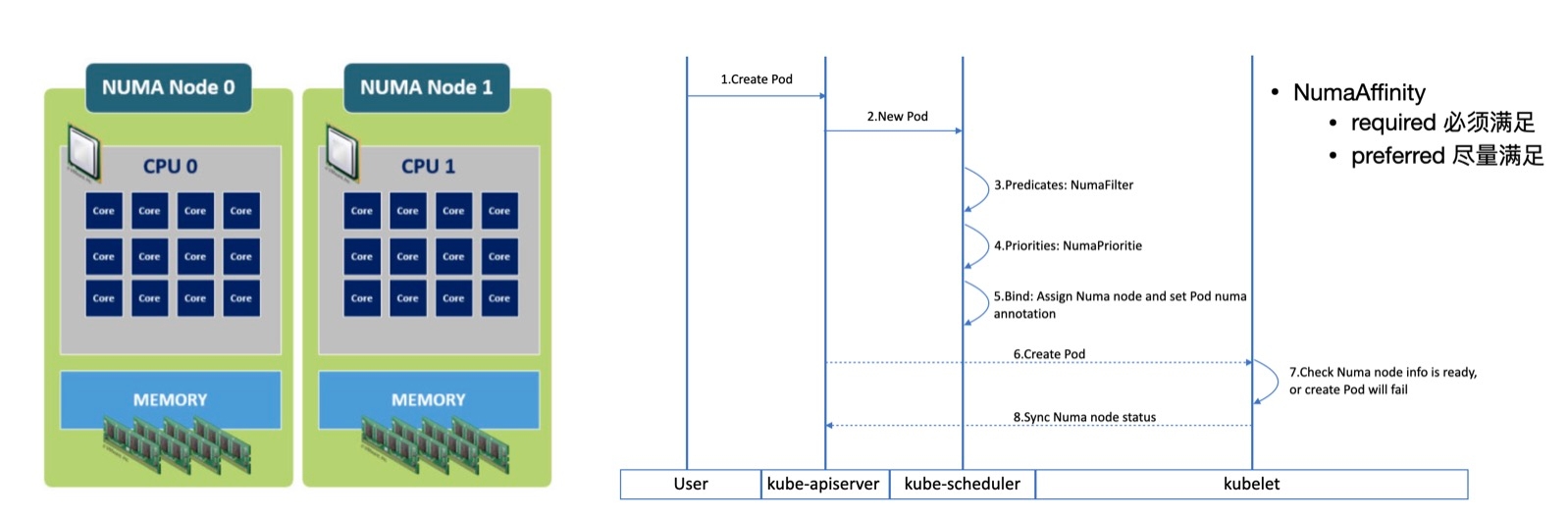 为了解决这个问题,我们在Node层采集了Numa Node的分配情况,在调度器层增加了对Numa Node的感知和调度,并保证资源使用的均衡性。对于一些强制需要绑定Node的敏感型应用,如果找不到合适的Node则扩容失败;对于一些不需要绑定Numa Node的应用,则可以选择尽量满足的策略。