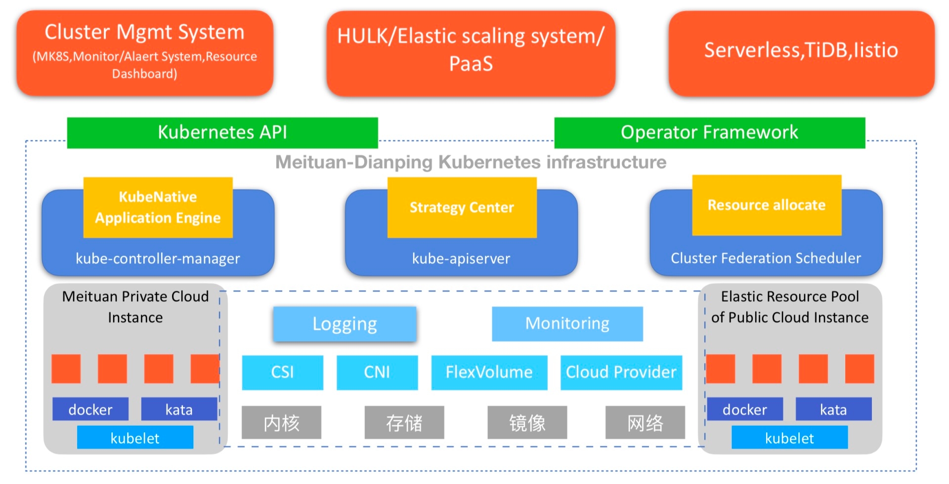 下图是当前我们基于Kubrnetes引擎的调度系统架构,构建了以Kubernetes为核心的统一的资源管理系统,服务于各个PaaS平台和业务。除了直接支持Hulk容器化之外,也直接支持了Serverless、Blade等平台,实现了PaaS平台的容器化和云原生化。