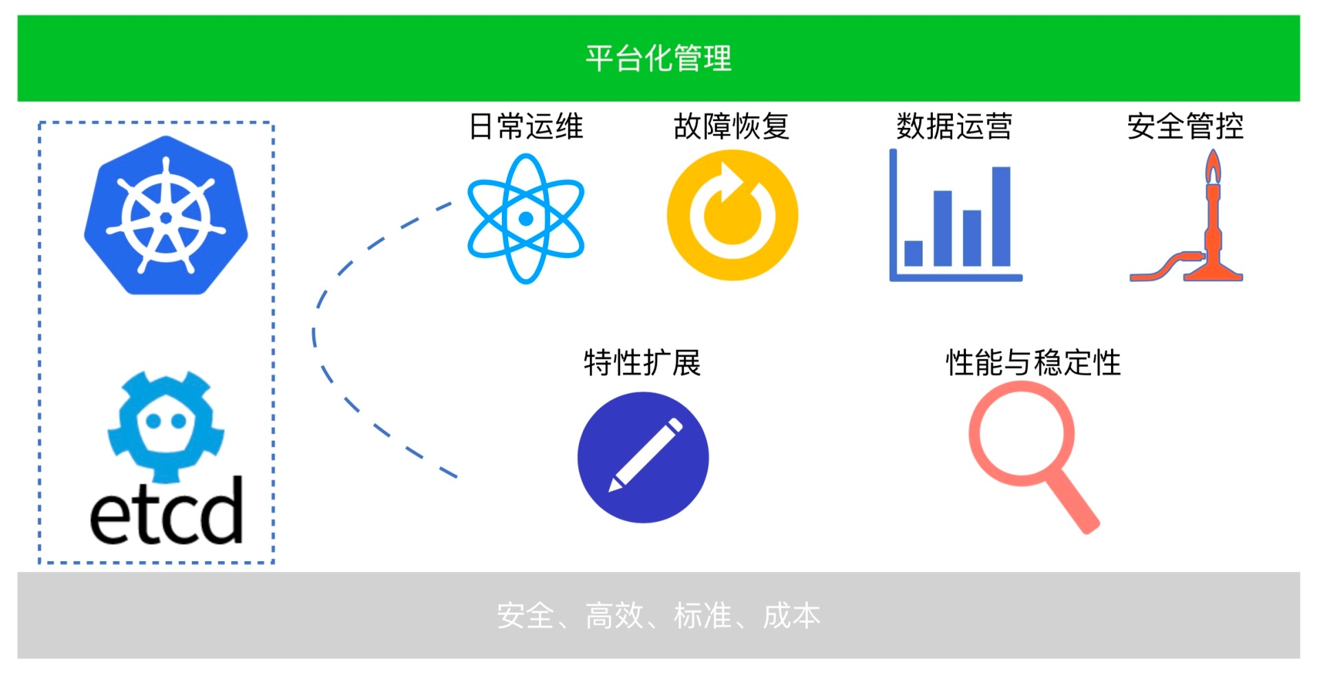 在Kubernetes与etcd集群的整个运营和运维能力建设上,我们关注的目标是安全运营、高效运维、标准化管理以及节约成本。所以针对Kubernetes与etcd集群,我们已经完成了平台化的管理运营,覆盖了特性扩展、性能与稳定性、日常运维、故障恢复、数据运营以及安全管控等6个方面。