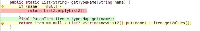 以上三个表每个表都包含了五项指标数据。 代码视图中,背景色代表的含义上文已经提到。 宝石的颜色代表分支覆盖率,鼠标移动到黄色宝石上,将会提示如“1 of 2 branches missed”,对于“name==null”,有true和false两种分支,这说明程序只执行了一种分支。绿色宝石“All 2 branches covered”。红色宝石“All 2 branches missed”。
