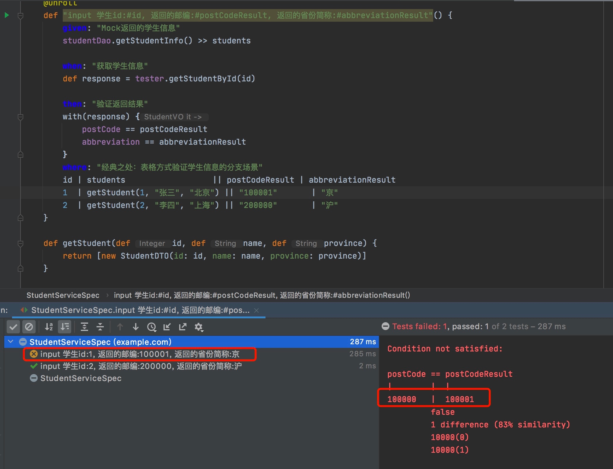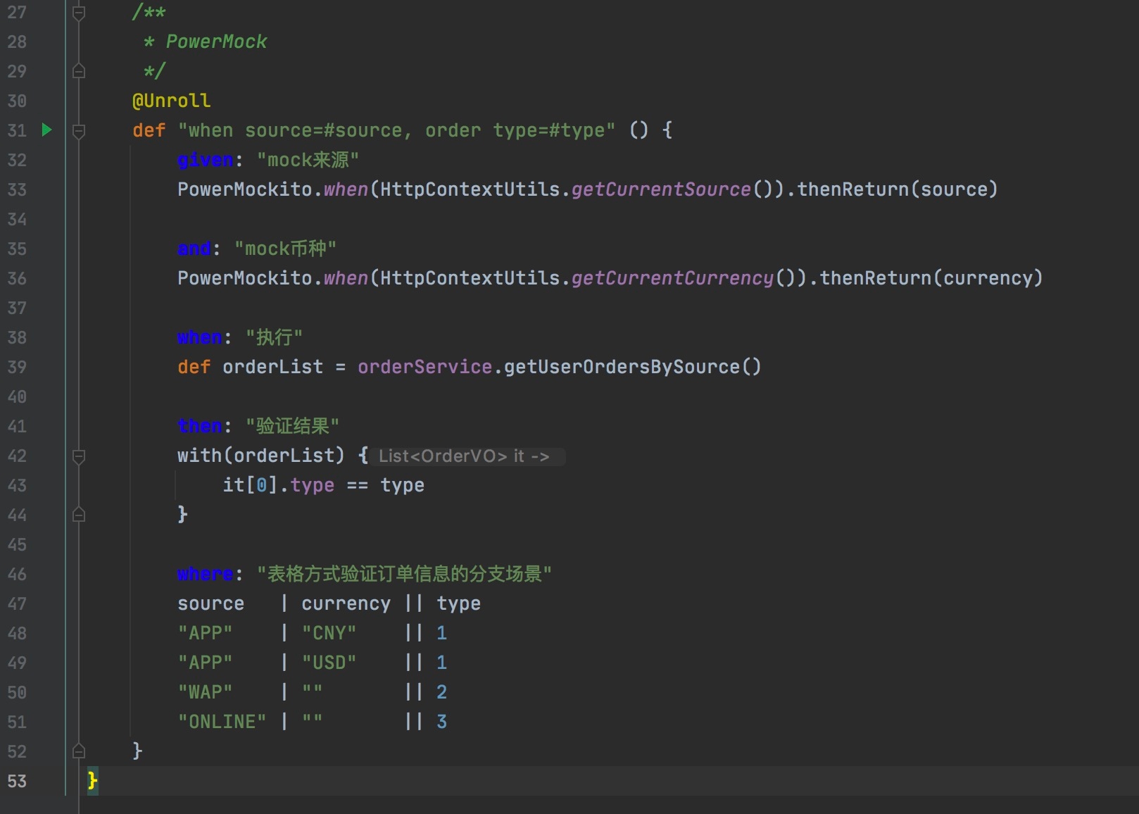 }能够看到上面的代码中有大量的if-else语句,Spock提供了where标签,可以让我们通过表格的方式来测试多种分支。