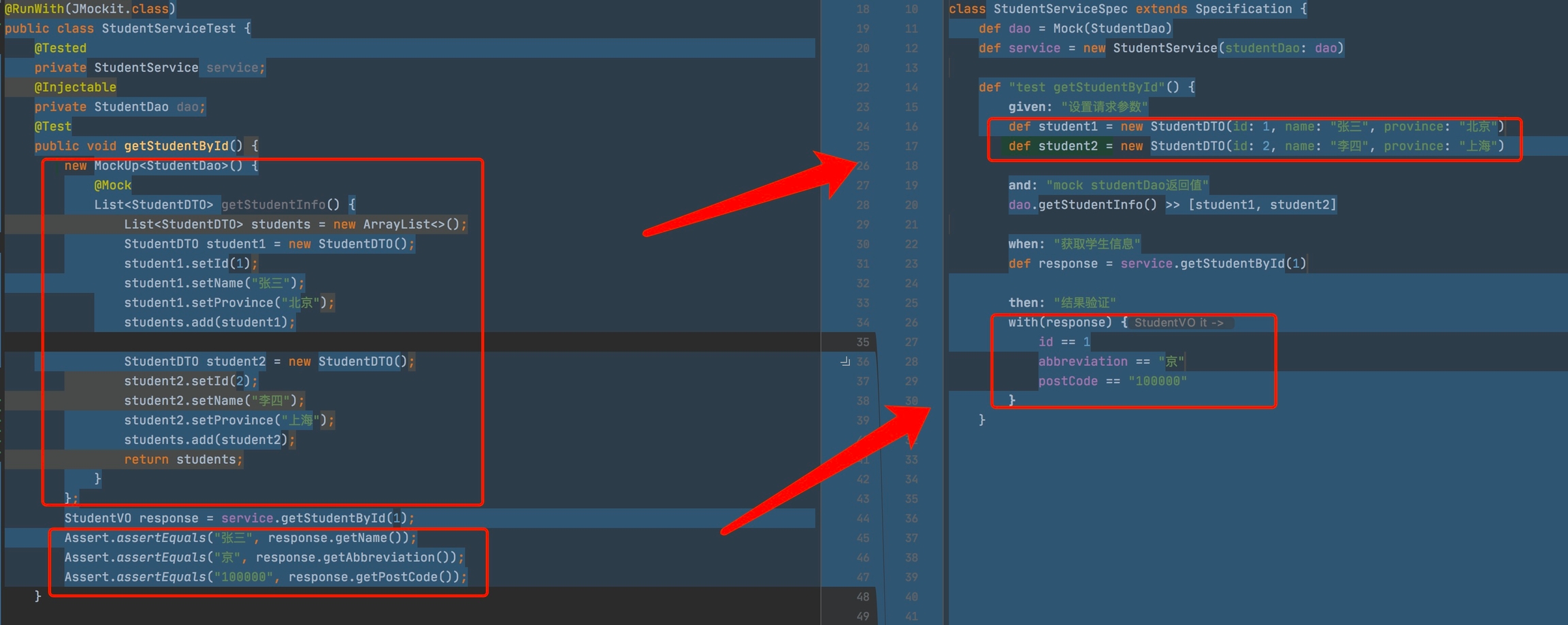 上图中左边使用Spock写的单元测试代码,语法简洁,表格方式测试覆盖分支场景更加直观,开发效率高,更适合敏捷开发。