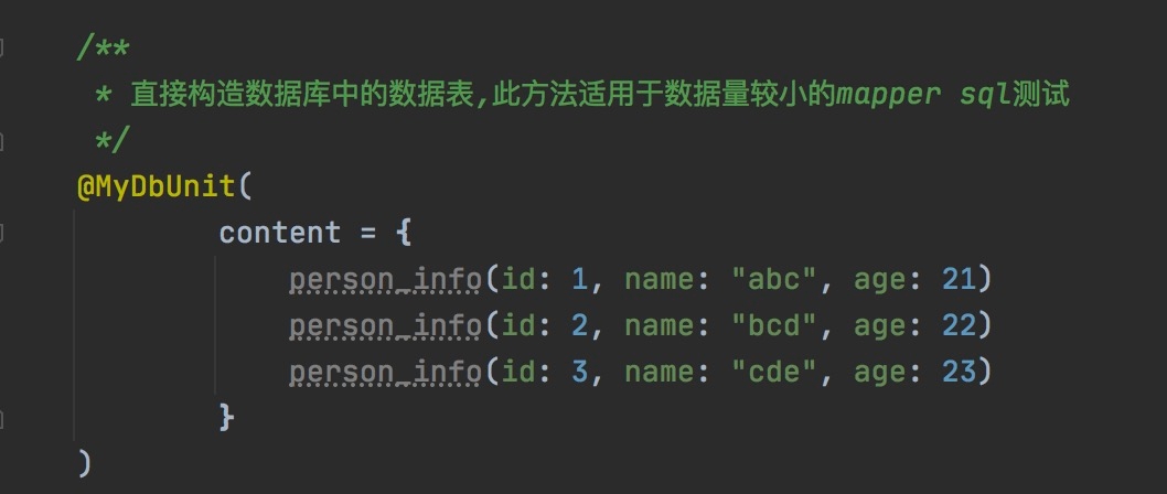 在setup()阶段,把数据库表中的Schema创建好,然后通过下面的@MyDbUnit注解的content属性,把数据导入到数据库中。person_info是表名,id、name、age是数据。