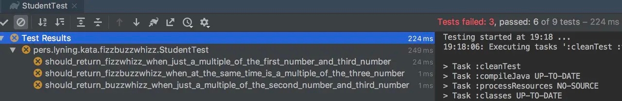 此时我遇到了两个问题,一个是第四个子任务的描述缺了 FizzWhizz 这种可能,所以我先完善了任务清单;第二个是我又从代码中闻到熟悉的坏味道,因此在自动化测试的支撑下,我开始建立起自信,并解决了 if else 过于冗长的问题:
