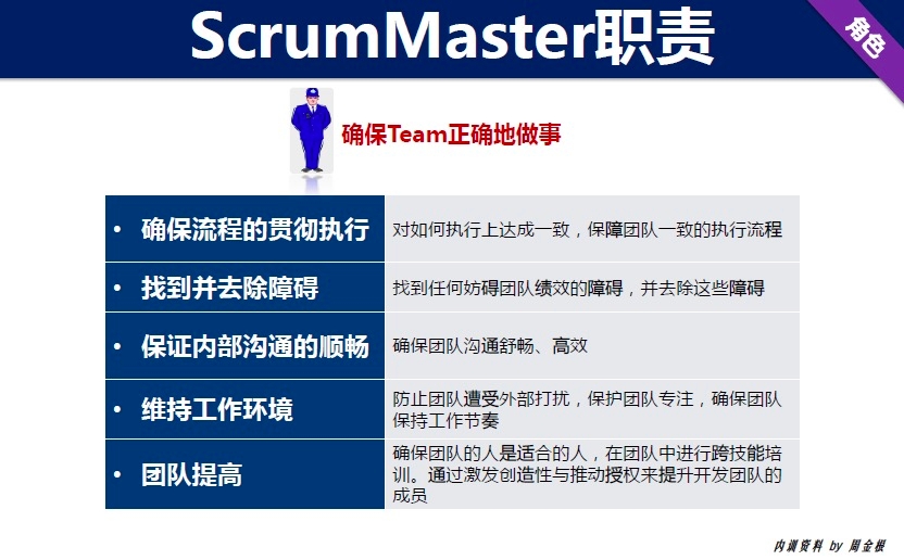 ScrumMaster负责确保团队内部和外部人员对Scrum有充分的理解,并保证Scrum被恰当地使用。他帮助团队之外的人理解流程,并明白和团队的哪些交互是有益的,哪些不是。